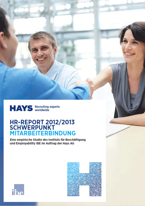 Dies ist das Ergebnis des neuen HR-Reports 2012/2013 des Instituts für Beschäftigung und Employability (IBE) und der Hays AG. In diesem Jahr beteiligten sich 714 Entscheider aus Deutschland (60 %), der Schweiz (25 %) und Österreich (13 %). Den Schwerpunkt des Reports bildet das Thema Mitarbeiterbindung.